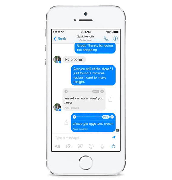 ഫെയ്സ്ബുക്ക് മെസഞ്ചര് വഴി വോയ്സ് മെസേജ് അയയ്ക്കുന്നതിന് മുന്നോടിയായി, ശബ്ദസന്ദേശം റിക്കോര്ഡ് ചെയ്യാന് മൈക്രോഫോണ് ഐക്കണില് ടാപ്പ് ചെയ്യണം. നിങ്ങള് മെസേജ് അയച്ചുകഴിഞ്ഞാല്, ഫെയ്സ്ബുക്ക് ആ ശബ്ദസന്ദേശം ടെക്സ്റ്റാക്കി മാറ്റും. വോയ്സ് മെസേജിനരികിലുള്ള ഐക്കണില് ടാപ്പ് ചെയ്താല്, ശബ്ദസന്ദേശത്തെ ടെക്സ്റ്റില് കാട്ടിത്തരും.